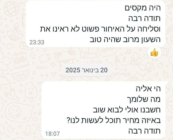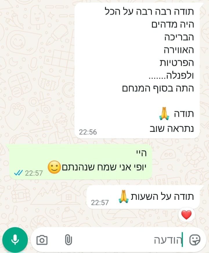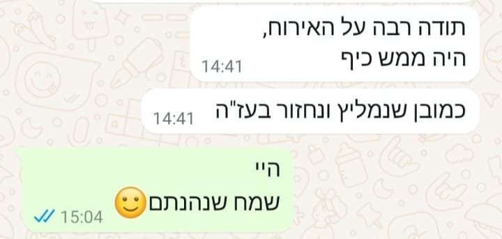השירות אישי, דיסקרטי וקשוב לכל פרט – כדי שתוכלו ליהנות מזמן איכות אמיתי, בשקט ובשלווה.